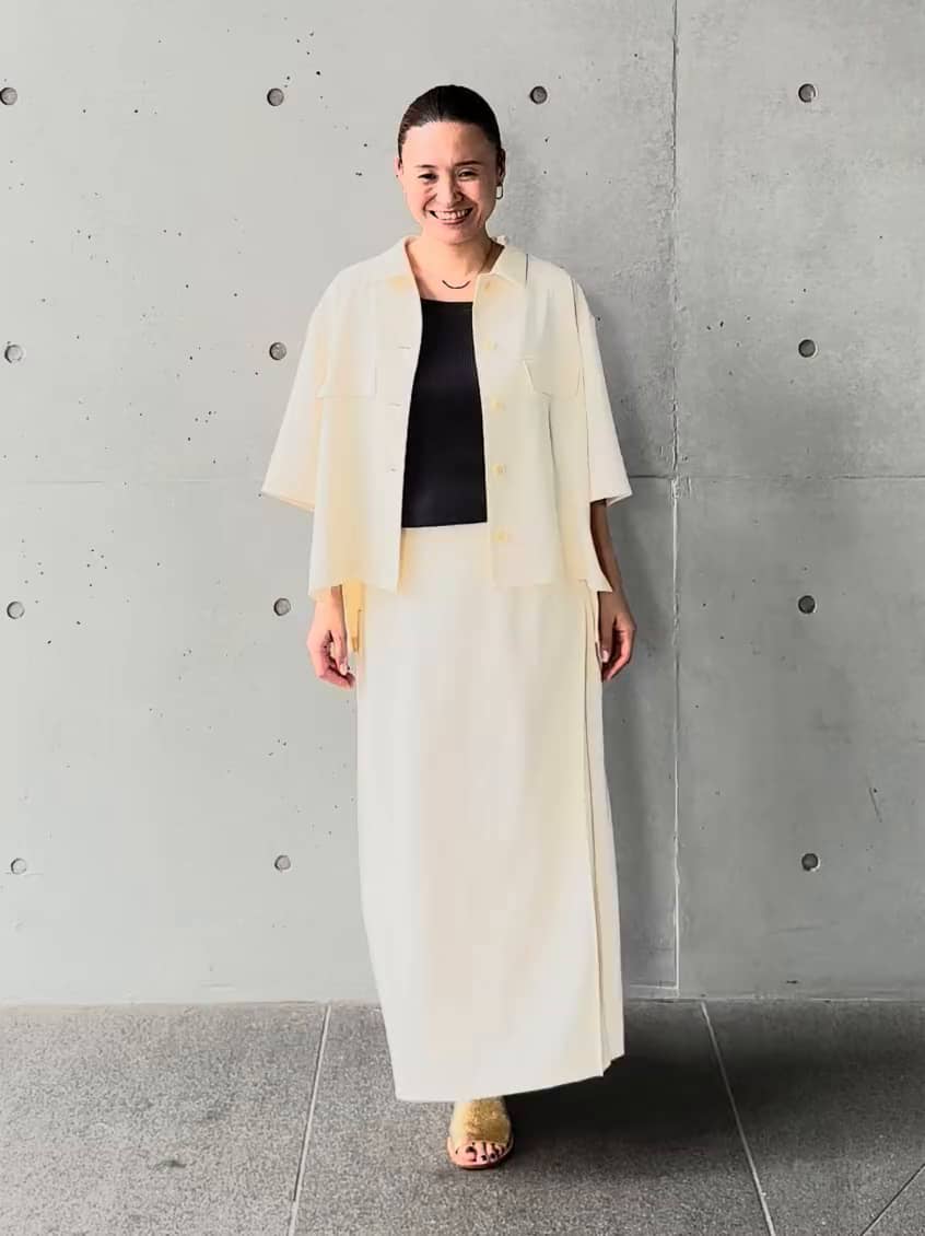 ジャケットライクな半袖シャツに、視覚効果で下半身をすっきり見せてくれる