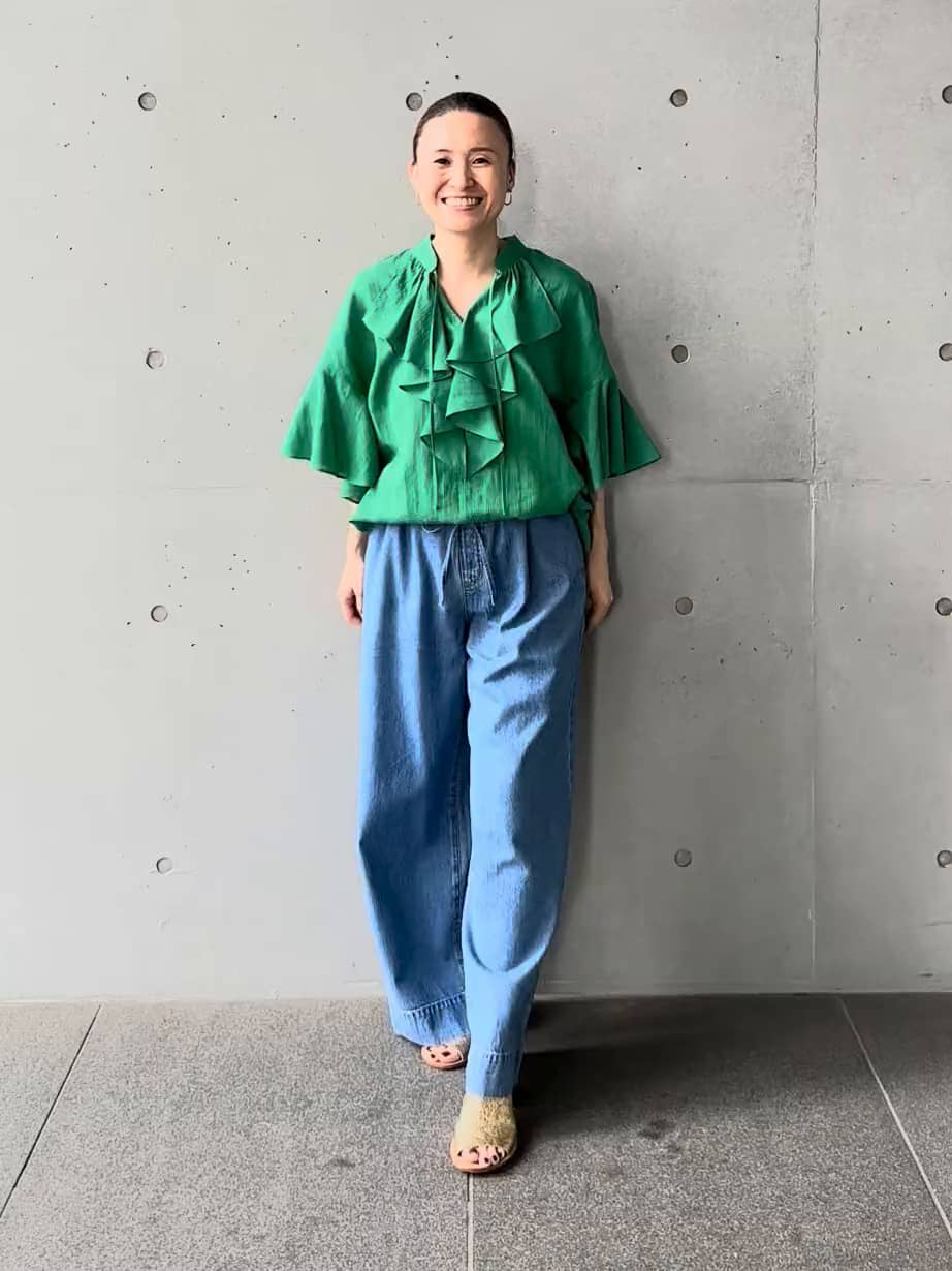 爽やかなブルーのイージーワイドデニムを合わせた、初夏にぴったりの軽やかスタイル。
