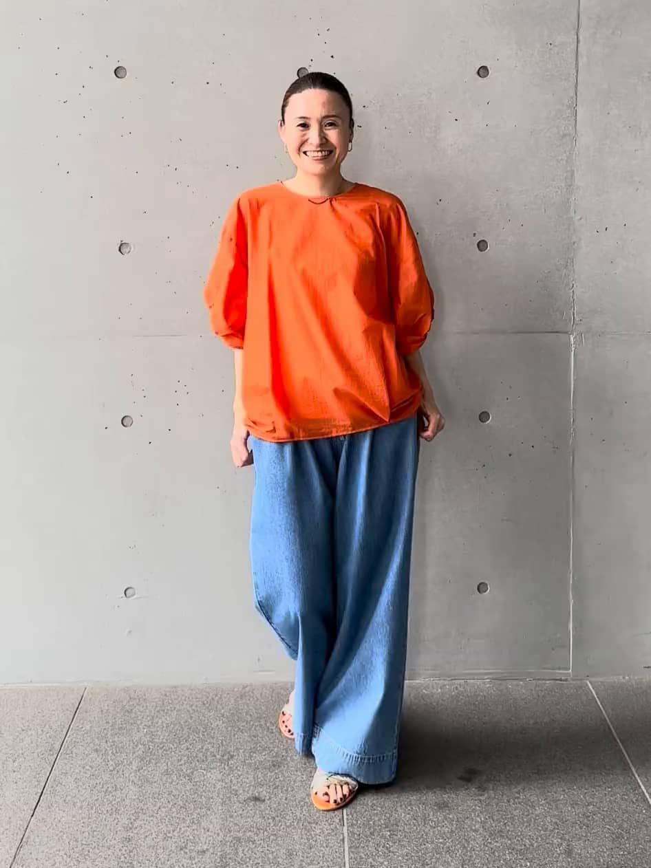 軽やかなブルーのイージーワイドデニムを合わせた爽やかスタイル。