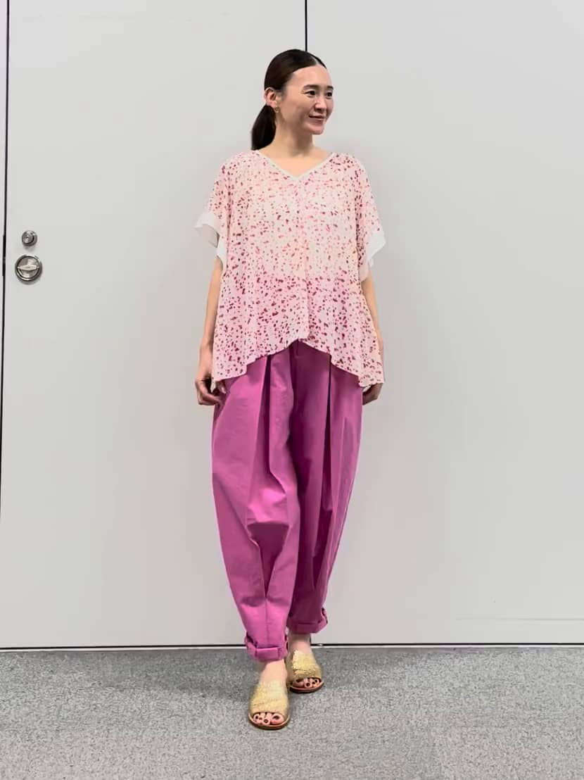 ワントーンでまとめたピンクのボックスタック入りバレルパンツと合わせることで、