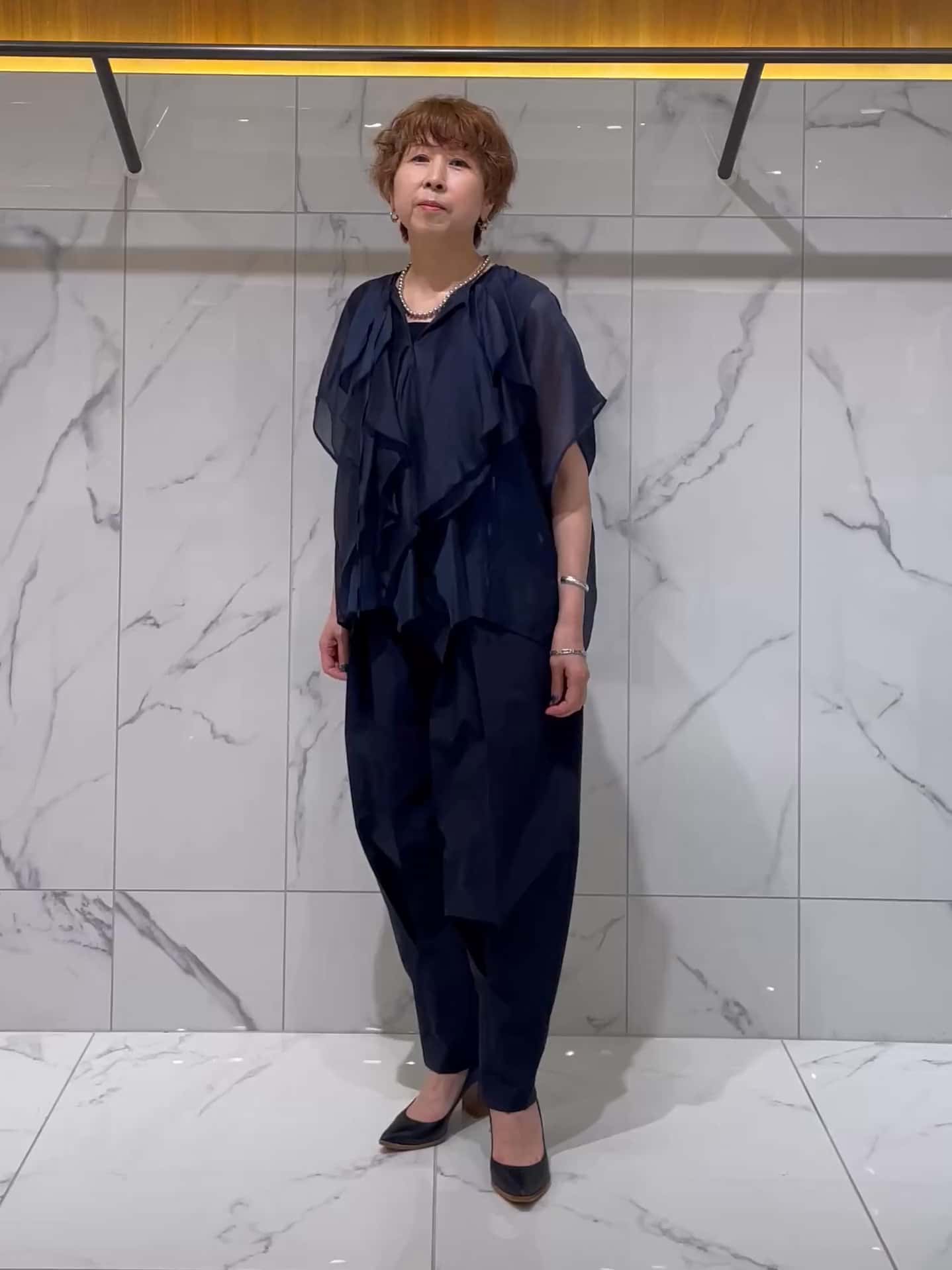 たっぷりとしたブラウスの分量感が身体をふんわり包みつつ、ネイビーで引き締めたパンツが全体をバランスよくまとめ、動くたびに表情が変わる上品で華やかな大人コーデに仕上がります。