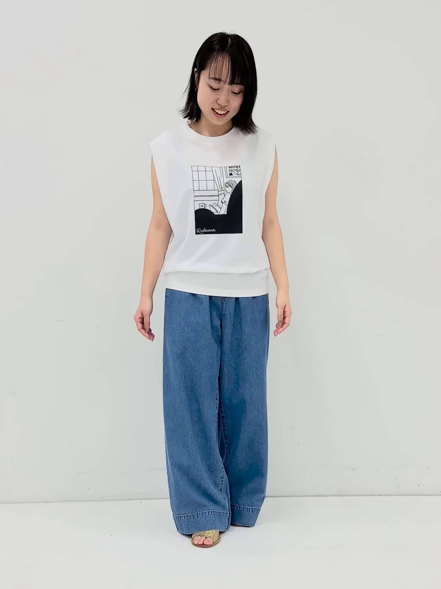 トップスは、MOGA原点回帰のオマージュから生まれた、ポップな女性イラストのプリントが印象的!合わせたブルーのワイドイージーデニムが、夏らしい軽快さと抜け感をプラス。1枚で着映えする旬コーデ、ぜひチェックしてみてください。
