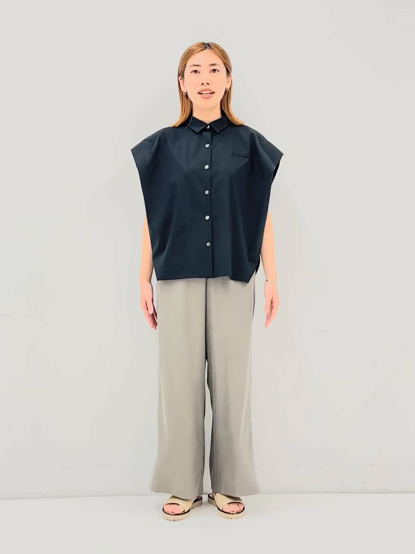 詰まったブラックシャツ。撥水素材でさらっと着られ、シンプルながら着映えする一枚です。合わせたのは、とろみのあるカーキのワイドパンツ。動きの出る素材感とサイドの切り替えが、リラックス感の中に程よいアクセント
