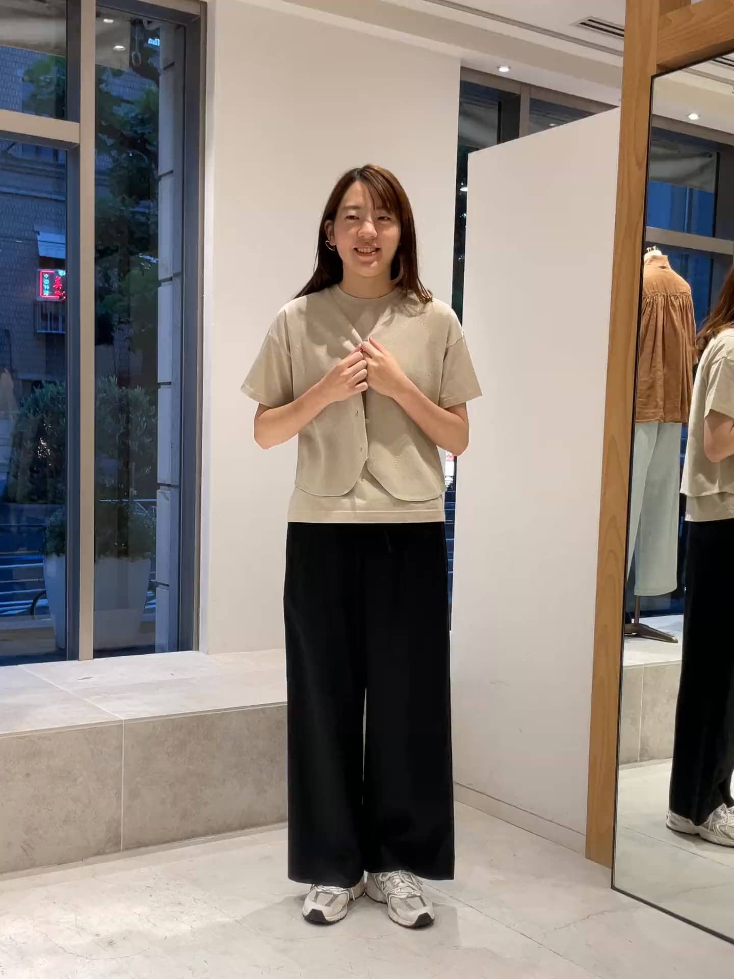 トラネコボンボンコラボTシャツのベージュを着用🐈⬛ネコの存在感がいちばん出るイラストでとても愛らしいです。Tシャツにベストで雰囲気を変えるのもおすすめ。