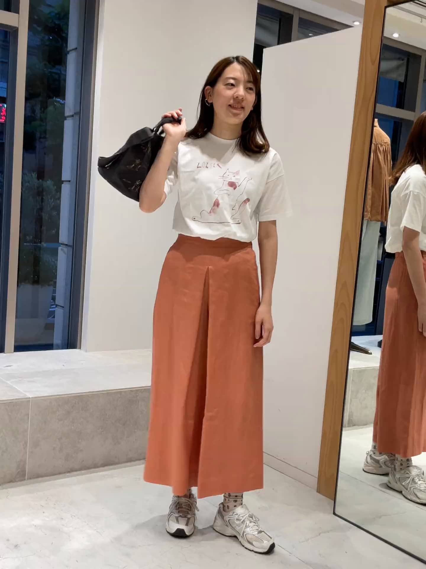 トラネコボンボンのホワイトを着用🐈⬛3色の中でいちばんインパクトのあるポージングのネコTシャツ。絵柄がピンクなので明るいサーモンピンクのバギーと組み合わせてデイリーファッションに。