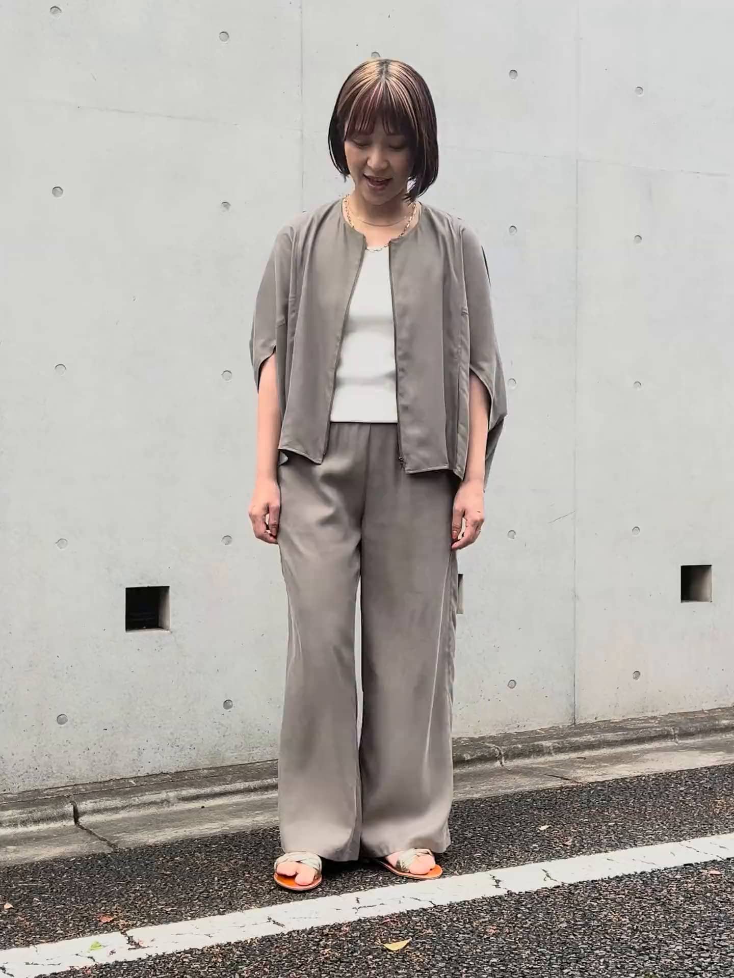 織は変形ドルマンと立体感のあるコクーンシルエットで、自然なニュアンスが生まれます。パンツはとろみ素材の落ち感が美しく、歩くたびに揺れる上品な一本。初夏のオフィスにも活躍し、セットでも単品でも着回し力抜群です。
