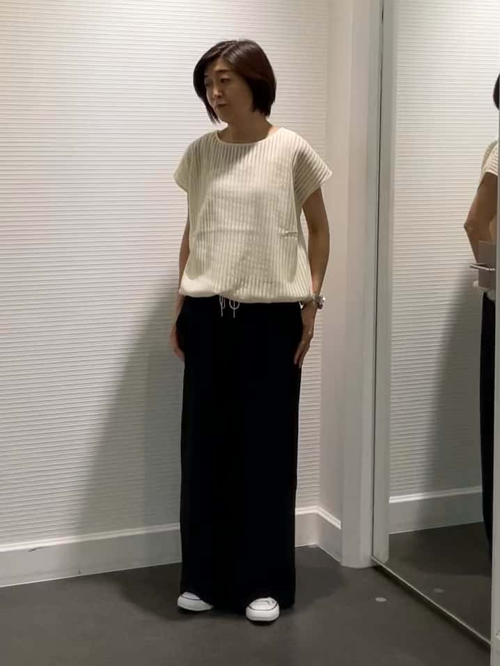 オフ×ネイビーの配色で、爽やかさときちんと感を両立させた、大人の夏スタイルです。