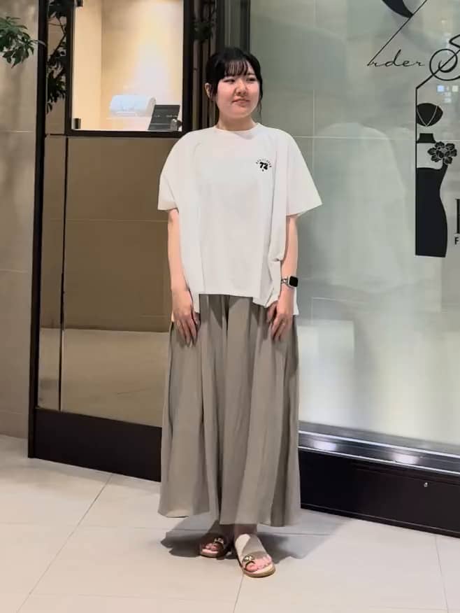 グレージュのワイドパンツは、スカートのような雰囲気の柔らかな落ち感で女性らしいニュアンスをプラス。