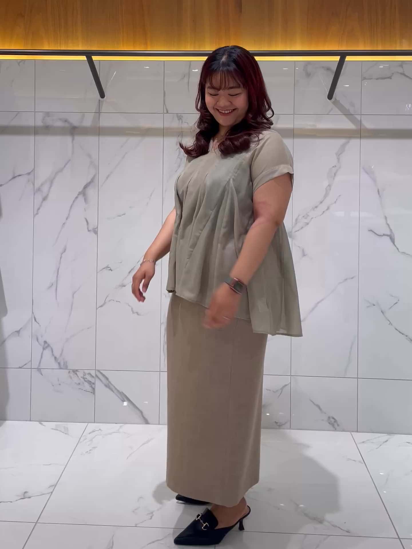 軽やかで動きのあるシルエットが魅力のカーキのボイルブラウスに、上品な光沢感とナチュラルさを併せ持つベージュの麻調スカートを合わせた、大人のリラックスコーデ。落ち感のあるブラウスが女性らしさを引き立て、