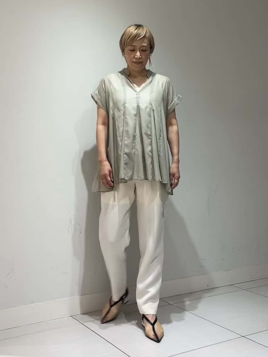 軽やかに揺れるシルエットが魅力のカーキのボイルブラウスに、オフホワイトのサテンベルト付きテーパードパンツを合わせた、上品カジュアルコーデ。ほんのり透け感のあるカーキが落ち着いた大人の印象を与えつつ、パンツのオフカラーが爽やかさをプラス。動くたびにひらりと揺れるブラウスと、ハリのあるパンツのバランスが絶妙な、夏に映える着映えスタイルです。