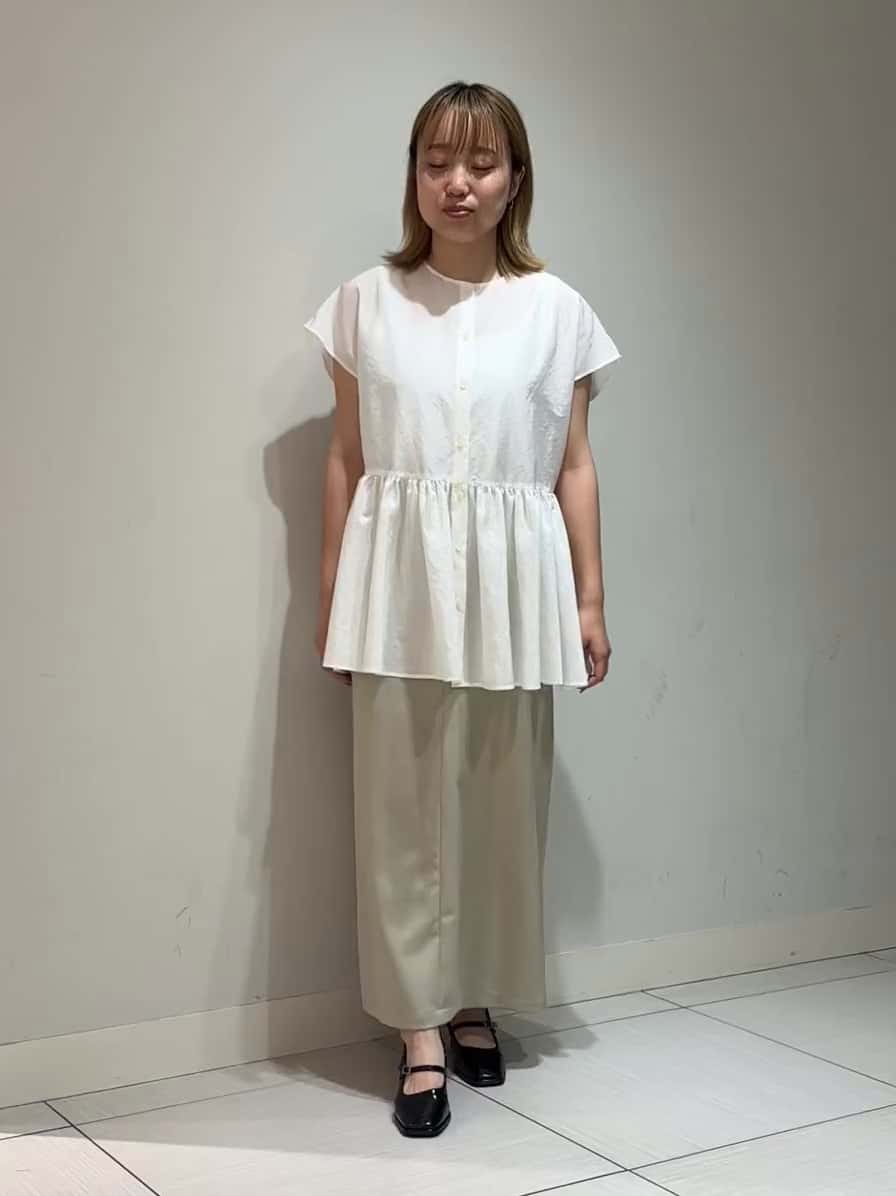 今回はライトベージュのタイトスカートを合わせて、ちょっぴりきれいめな雰囲気にまとめました。スカートはウエストにゴムが入っているので、楽ちん&後ろスリット入りで動きやすさも◎ ブラウスは前を開けて羽織りとしても着られます!