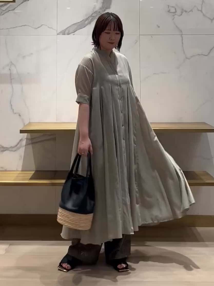 ふんわり軽やかな薄いグリーンのワンピースに、クラフト感のあるカーキのレースパンツをレイヤード。ワントーンの中に濃淡をつけたグリーンコーデは、統一感がありつつも奥行きのあるスタイリングに。ワンピースのひらっとした動きと、パンツのレースの繊細さが相まって、シンプルながら目を引く大人のレイヤードスタイルに仕上がります。夏のお出かけにもぴったりな爽やかコーデです◎