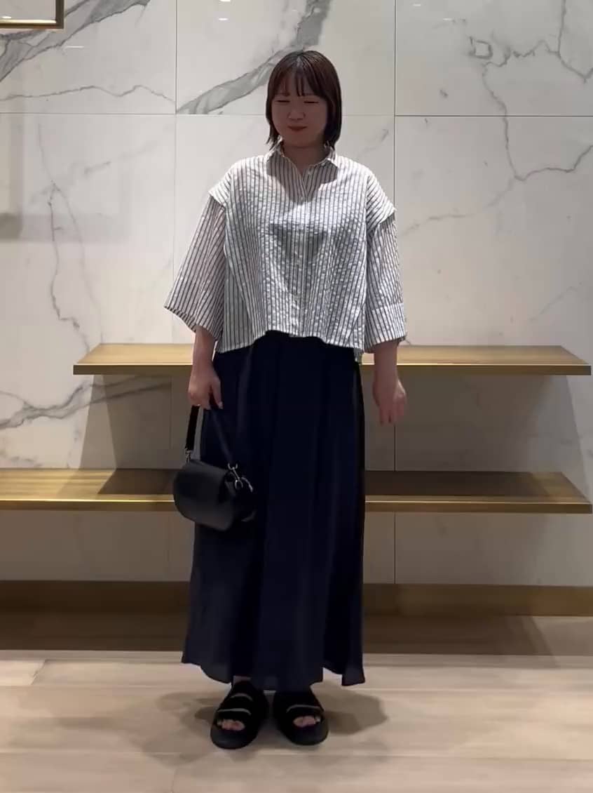 モノトーンのストライプが目を引くシアーシャツは、軽さとハリのバランスが絶妙で、暑い日にもさらっと羽織れる頼れる一枚。そんなライトなシャツには、たっぷりボリュームがありながら落ち感のあるブラックのワイドパンツを合わせて、動きのある女性らしいシルエットに。シャツの短め丈がパンツのフレアラインを引き立ててくれるので、スタイルアップ効果も◎モード感と抜け感のバランスがちょうどいい、大人のモノトーンコーデです。
