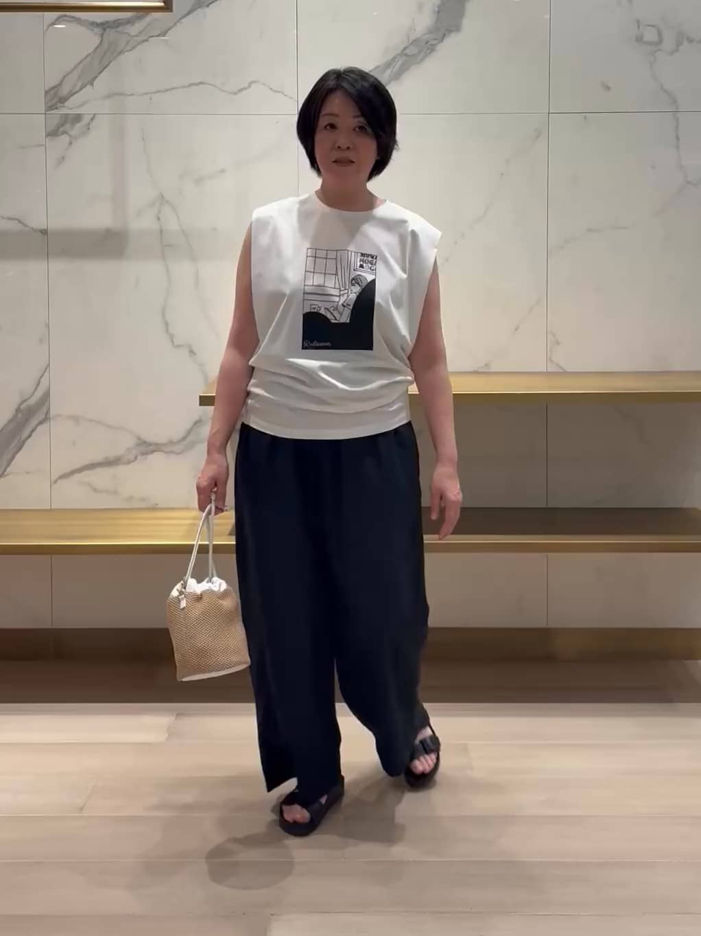 ネイビーのイージーストレートパンツを合わせて、爽やかなカジュアスタイルに。