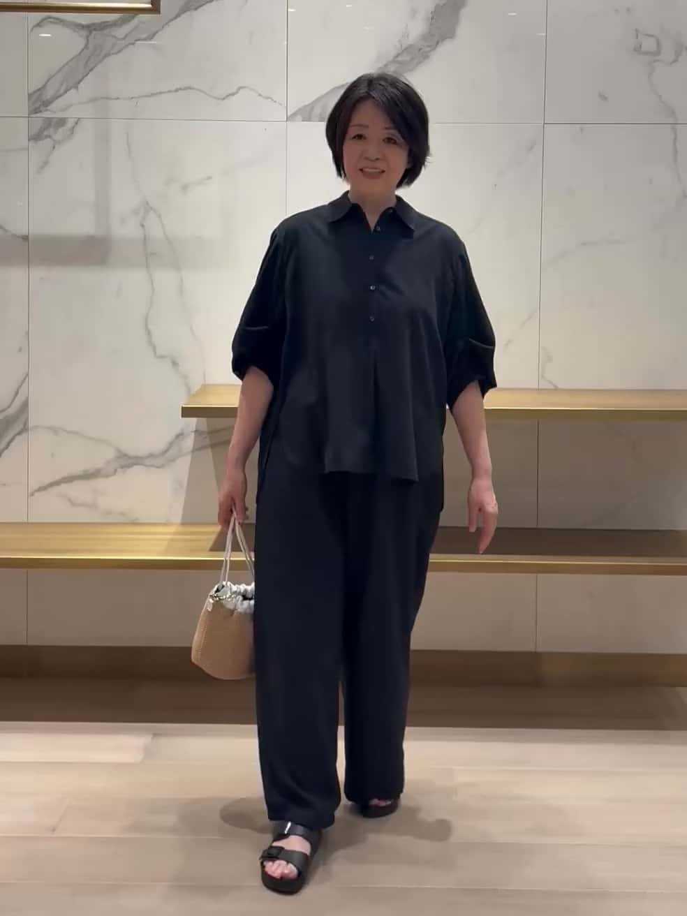 今回は同素材のネイビーのパンツとセットアップで着用。ストレートシルエットが脚をまっすぐきれいに見せてくれます。