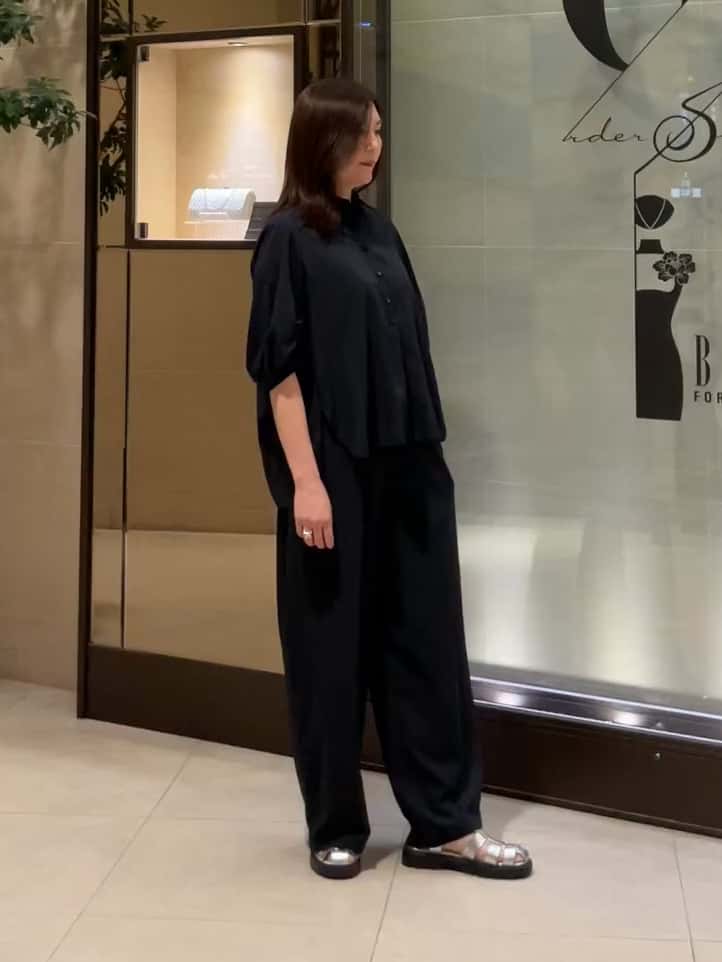 同素材のイージーストレートパンツと合わせたセットアップスタイルは、縦のラインを強調してくれるので、