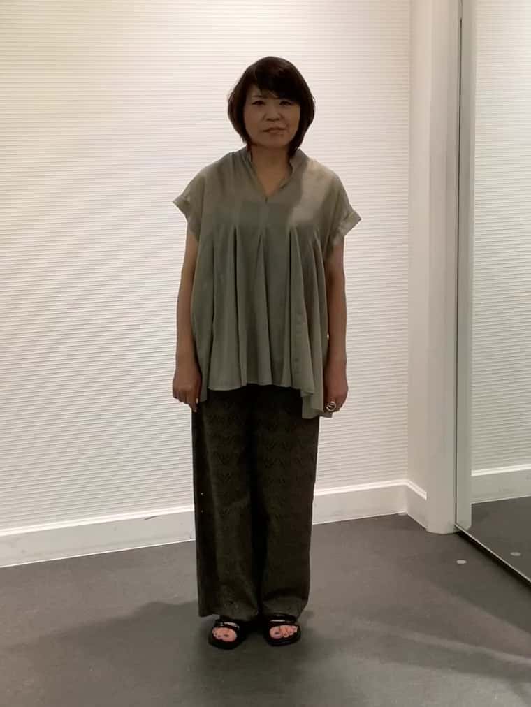 動きのあるシルエットがとてもきれいな、カーキのブラウス。ボリューム感はあるのに落ち感があって、
