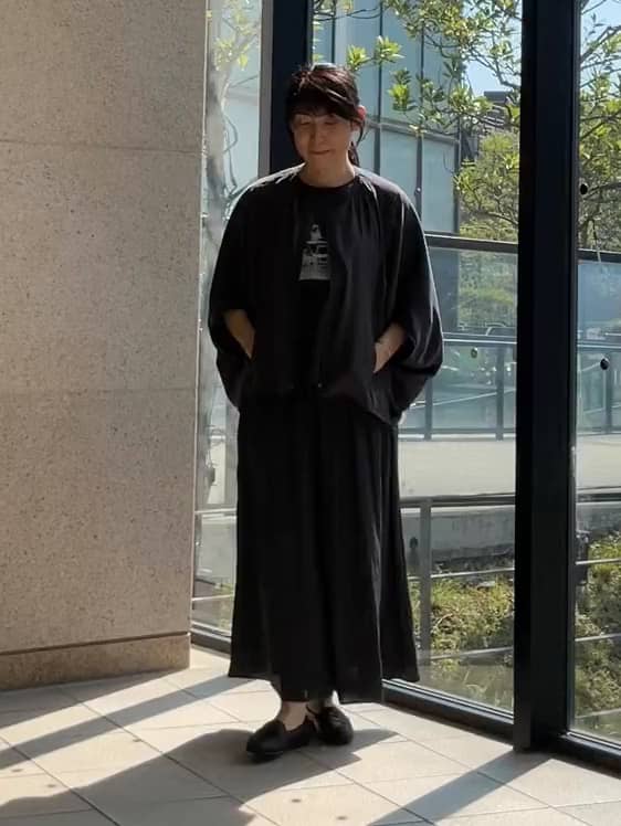 ボトムはスカート見えするたっぷりフレアのワイドパンツ。柔らかな落ち感で動きに表情が出て、女性らしさも◎。インナーにSHOGOSEKINE×MOGAのフォトTを合わせポイントにしました。