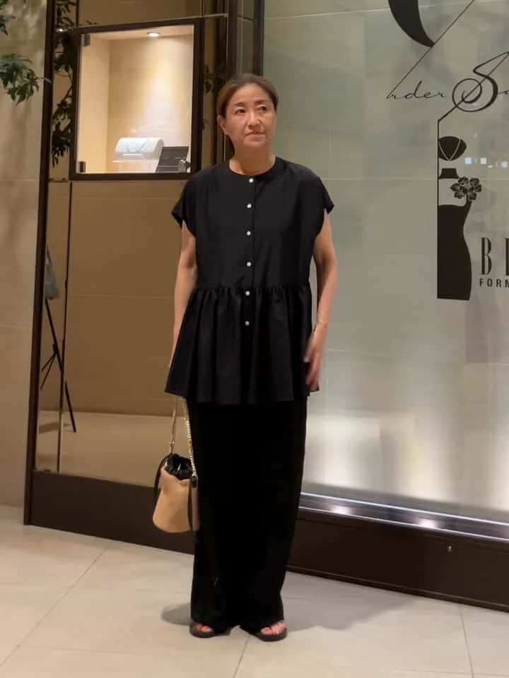 ボトムにはコットンレースのワイドパンツを合わせて、異素材の表情で奥行きのあるブラックコーデに◎