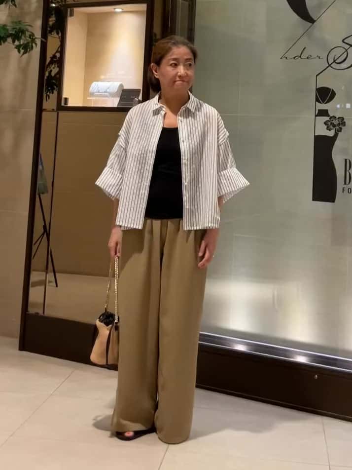 ボトムは、ベージュのイージーストレートパンツを合わせています。UVカット・吸水速乾の夏に嬉しい機能性素材でこれからのシーズンに活躍します◎