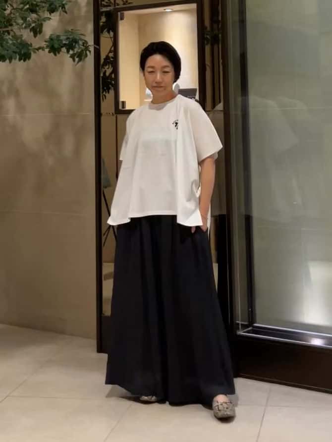 ふんわりとボリュームのあるフレアーシルエットが魅力のワイドパンツと合わせれば、涼しげで女性らしい夏の上品モノトーンコーデが完成します。