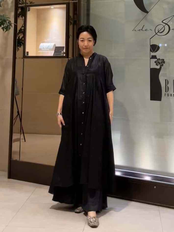 軽やかで落ち感のあるボイル素材のワンピースに、ひらりと揺れるフレアーシルエットが美しいワイドパンツをレイヤード。たっぷりとした分量感も軽さのある素材同士で重くならず、動くたびに揺れる表情が大人の余裕と華やかさを演出。ブラック同士のレイヤードがモード感を引き立てる、涼しげで洗練された夏のブラックコーデです。