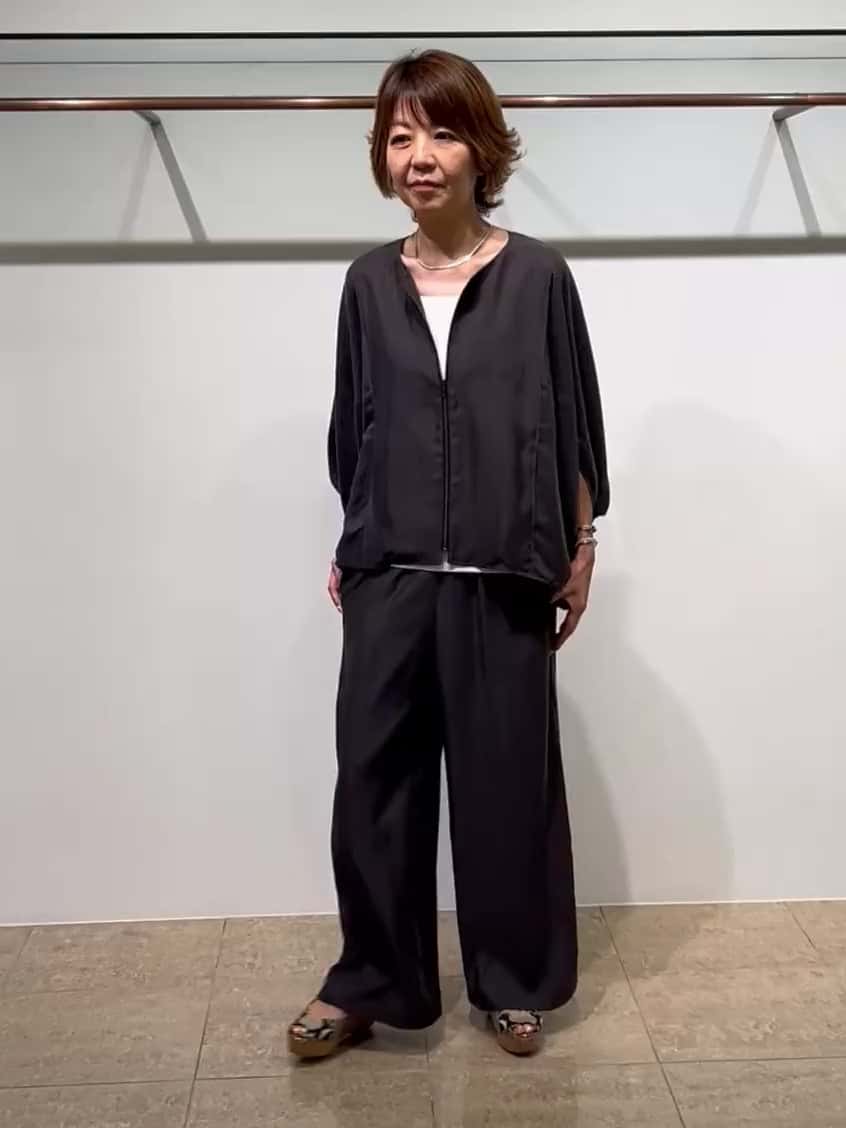 軽量で扱いやすい羽織と同素材のワイドパンツとのセットアップコーディネート。単品でも合わせやすい人気の素材です。53BFJ120 2号 ②チャコール52BKW340 2号 ①オフ53BFP091 1号 ②チャコール