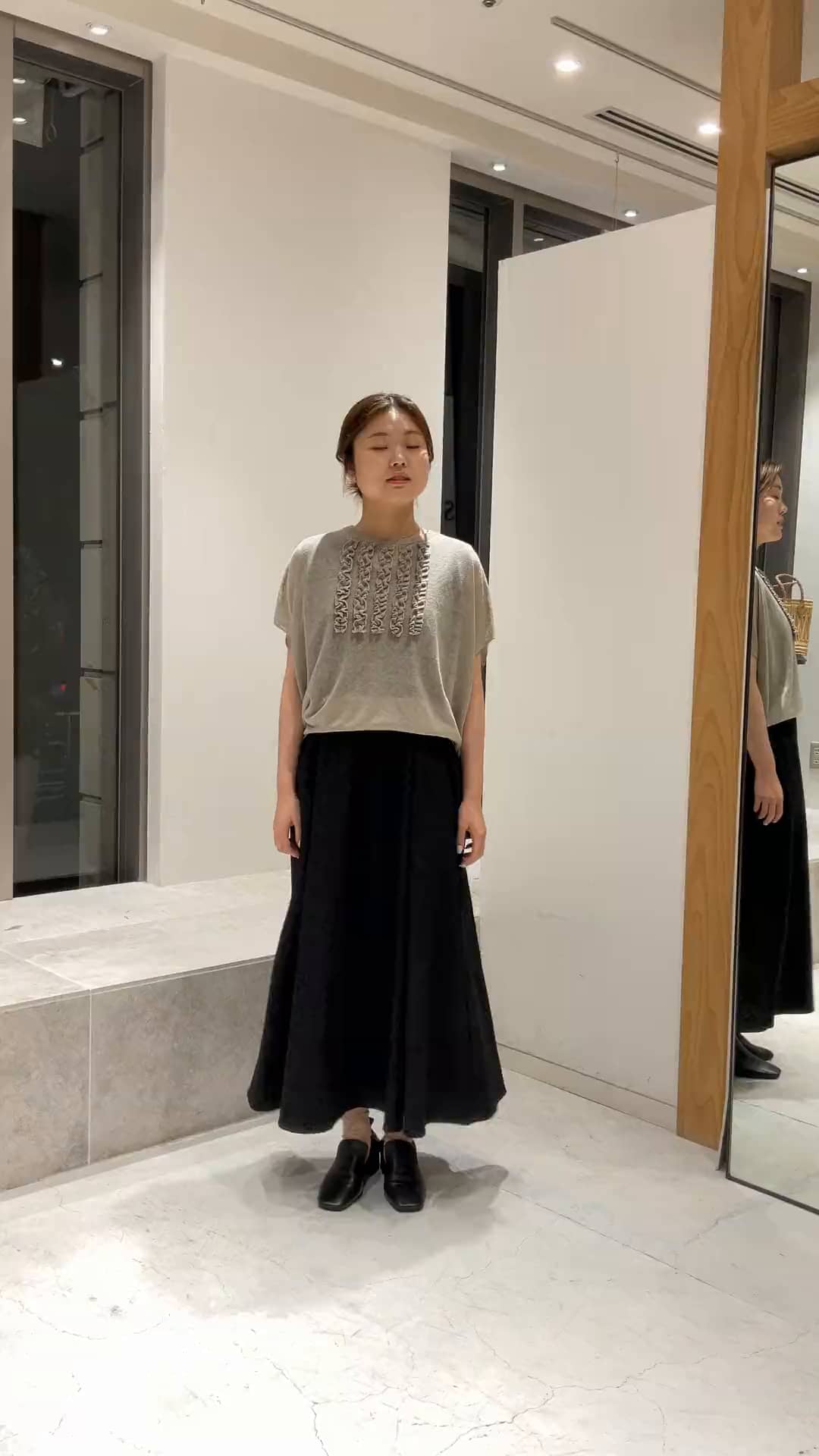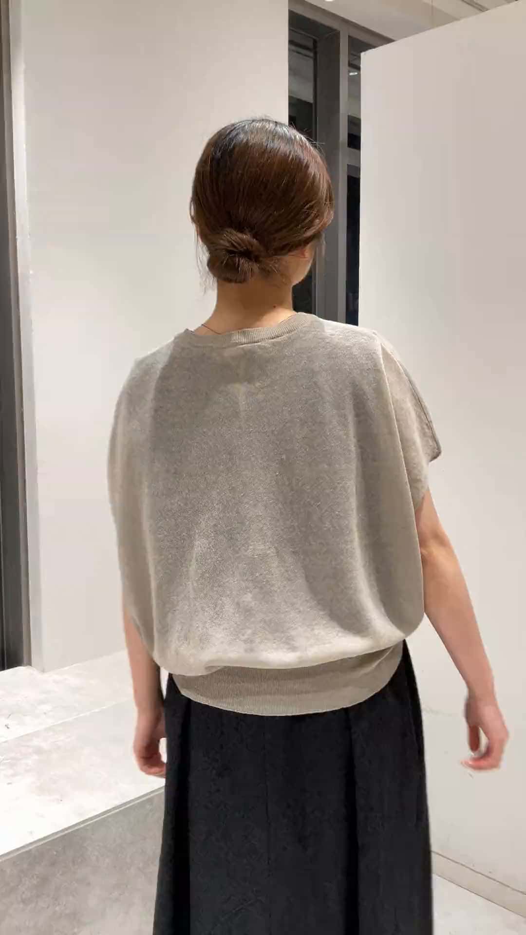 ディテールが上品で大人な雰囲気のコーディネート。胸のフリルがポイントのノースリーブプルオーバー。リブがしっかり効いていて程よくコシのある素材なのできれいにたゆみ、ワンピースの上に重ねても素敵です。