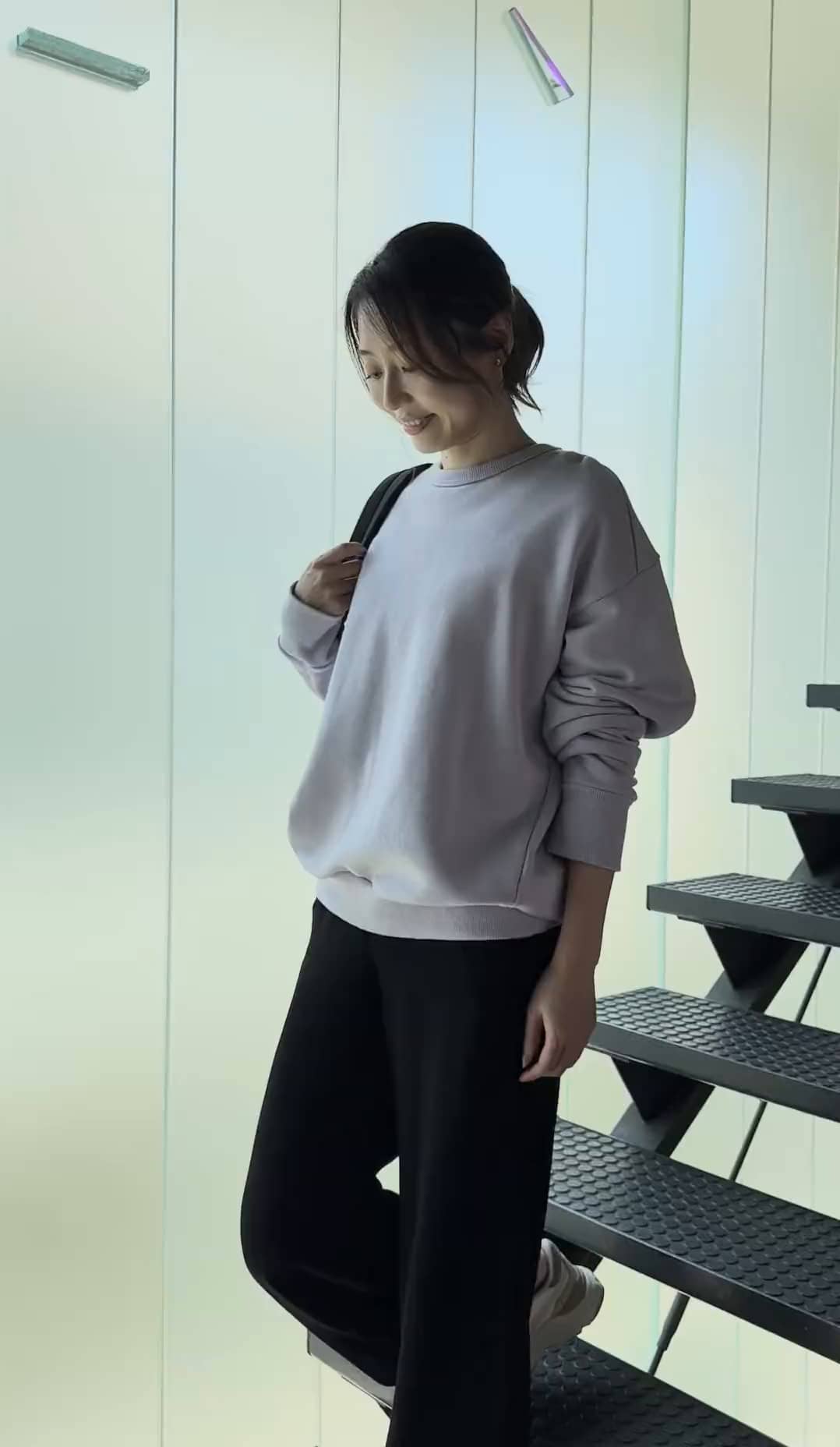 肩が落ちるゆるめのデザインと長めの袖がほどよい動きを出してくれるので、スウェットでもラフになりすぎません。