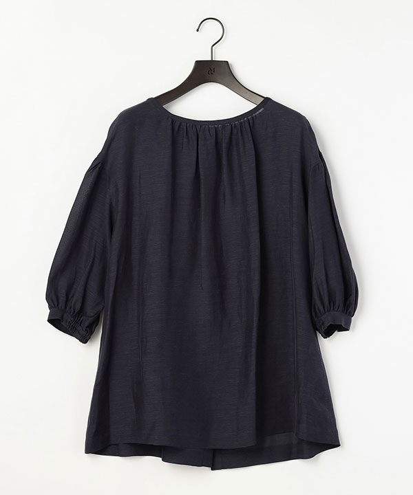 襟ぐりと袖にギャザーの入った麻素材のボリュームブラウスは、
