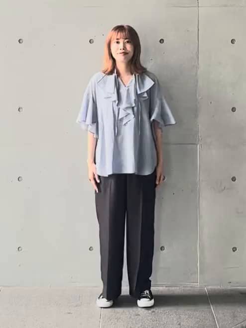 華やかなフリル袖が目を引く、夏らしいブルーのブラウス。ふんわりしたシルエットで風通しもよく、見た目も着心地も涼しげです♪