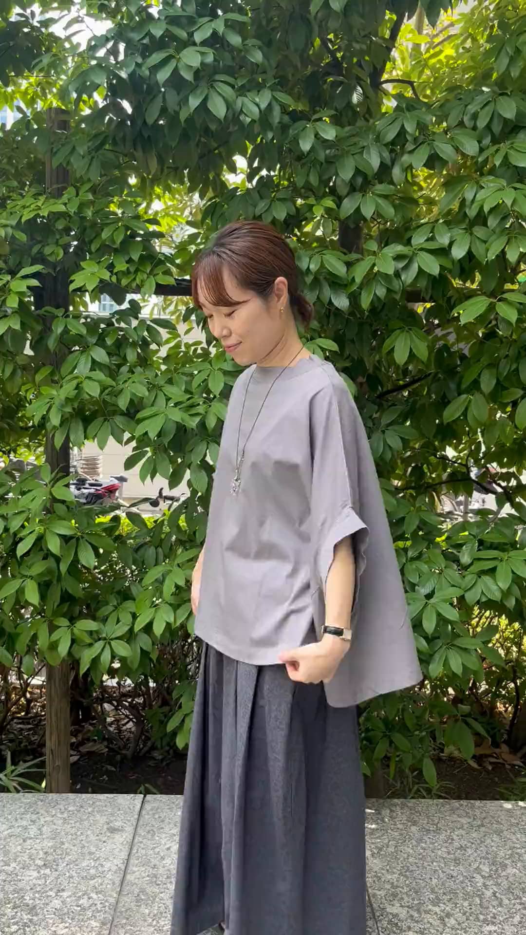 ゆったりとポンチョのようなシルエットの涼しいカットソー。光沢がありカジュアルでも大人っぽく着られます。定番ボトルパンツはリバティ!ロワズィールらしいオーバーダイの柄になります。