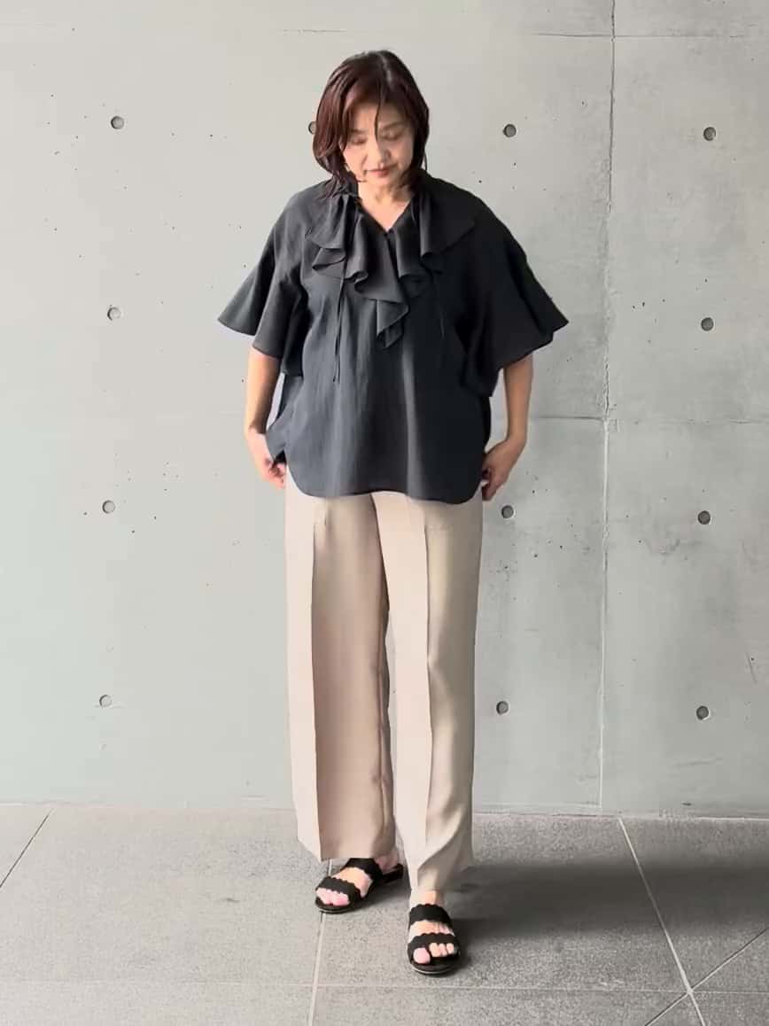 ブラウスはフリル袖がしっかり二の腕をカバーしてくれるのが嬉しいポイント。ゆったりしていて着心地もラクです♪
