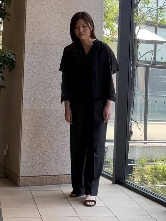 オールブラックでも素材感の違いで重く見えず、すっきり着られる大人の涼感コーデです。