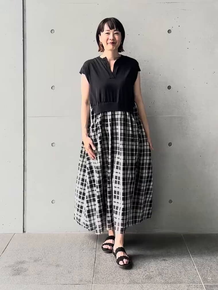 シャリ感のある麻混ニットと透け感チェックのドッキングで、一枚で華やかな印象に。