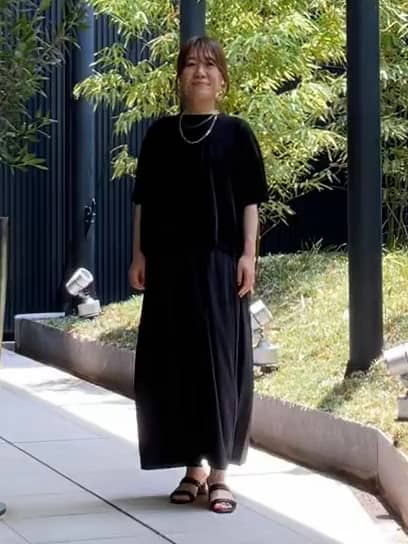 スカートは前にボリュームを出しつつ、後ろはすっきり見えのコクーンシルエットで小柄でもバランス良く着られます。