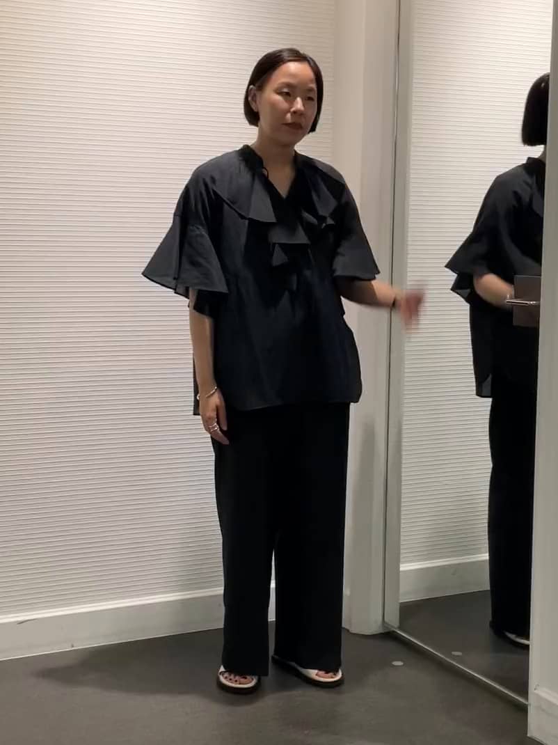 上品な光沢感のあるブラウスは、ゆったりシルエットと肘までのフリル袖で体型カバーも◎