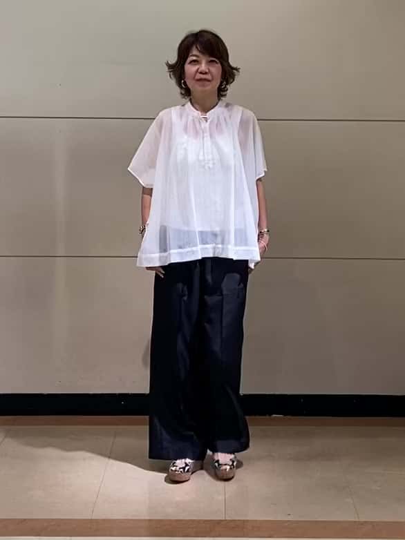 ピンストライプ柄のボイル素材。ゆったりシルエットで真夏でも涼しく着られます。着用サイズ感:ゆったり53FFB081 ①オフ 2号53FFP191 ②ブラック 2号
