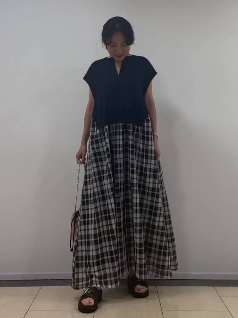 シャリ感のある麻混ニットに、透け感のあるチェック柄をドッキングした、大人の涼感ワンピース。
