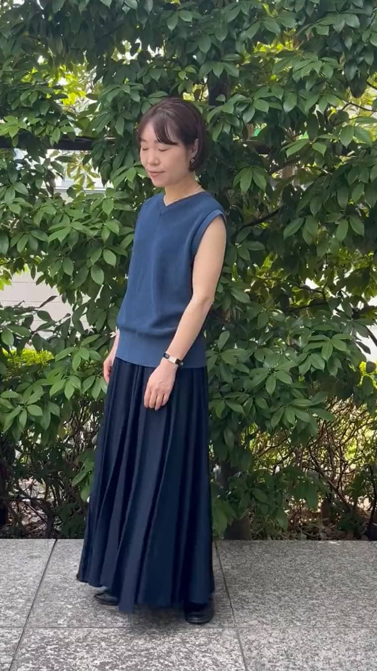 和紙素材のニットベストが軽くて涼しく着心地抜群!前後着用OKでV開きを前にしてみました。落ち感がきれいなフレアスカートと好相性です。