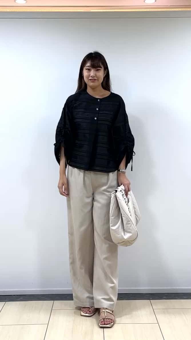 着用感:透け感のあるシアーブラウスなので、ブラックでも軽やかさが出てお使いしやすいです。袖はシャーリングでボリュームを作っても良し、ストレートに着ても良し。袖の長さを調節できるので、蒸し暑さが残る秋口まで、長い期間お使いいただけます。