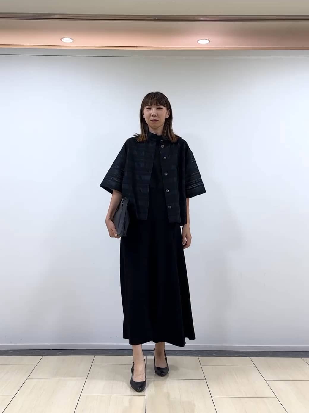 着用感:晩夏に向けた、清涼感のあるスタンドカラーの羽織りブラウスです。ブラックは特に多場面で着回しが効き、あると安心便利なアイテムです!