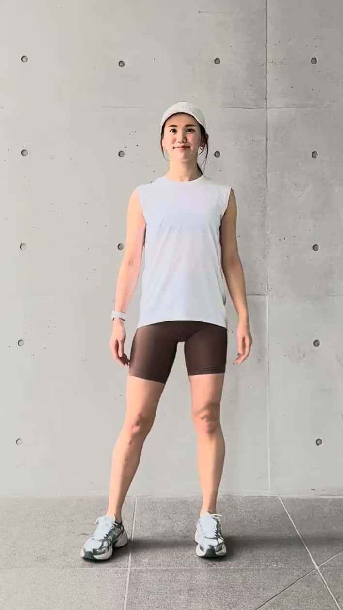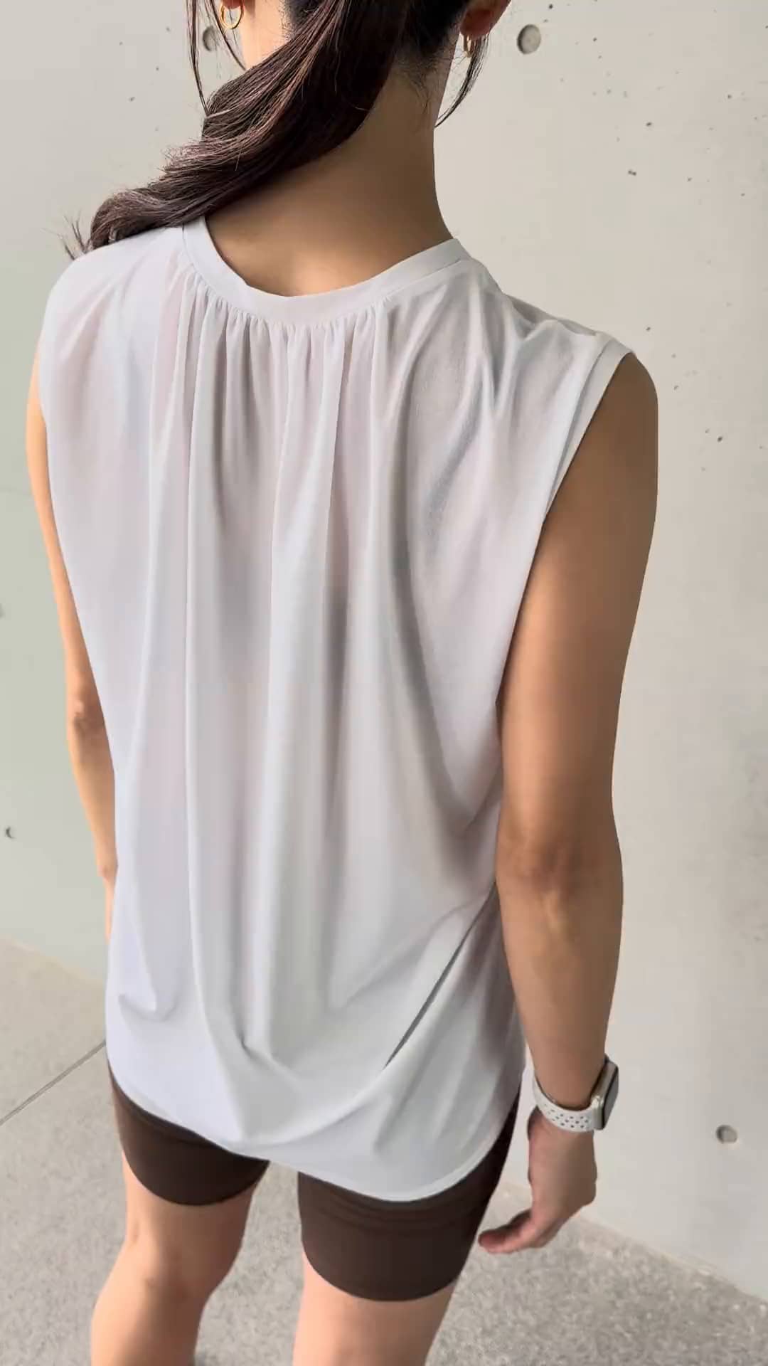ほどよいゆとりの白ノースリーブに、フィット感抜群のブラウンハーフレギンスを合わせた、涼感コーデです。