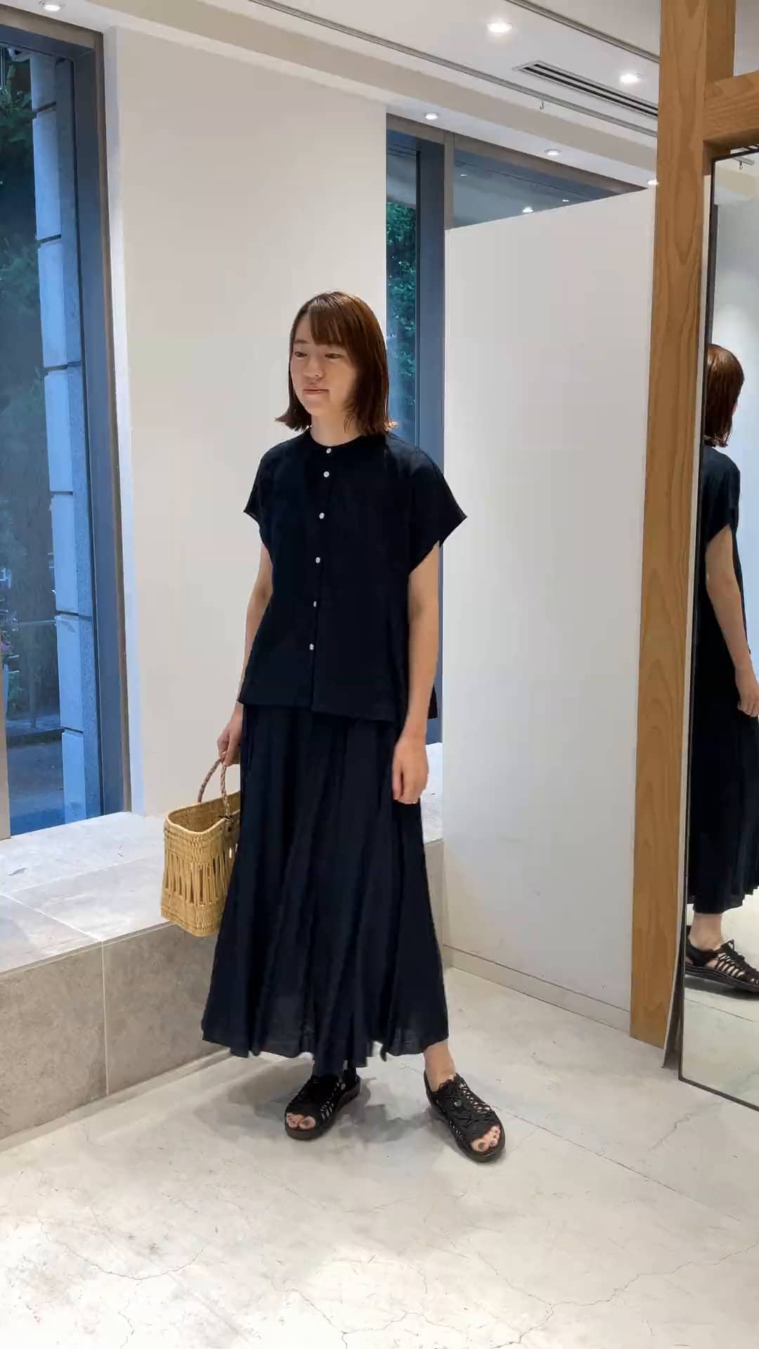レーヨンリネンスラブのセットアップ。体のラインを拾わず、きれいにすっきり見えします。前後着用OKなブラウスなので着用シーンによって気分を変えられますよ。