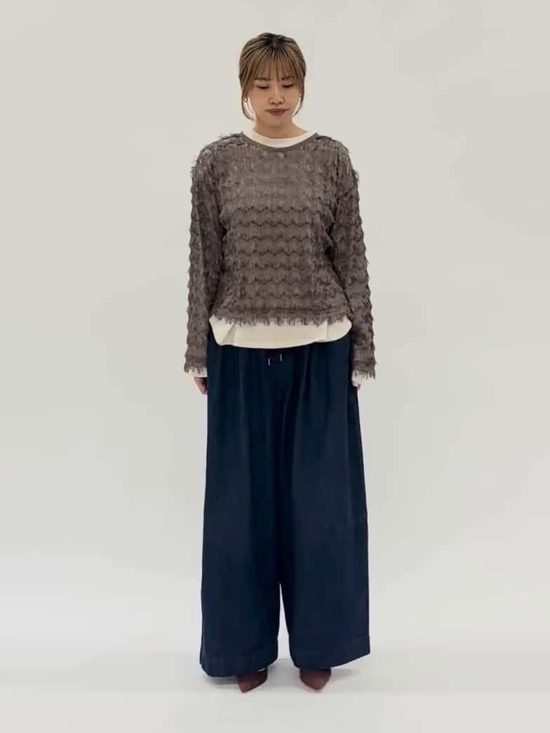 毛足のある透け感トップスを合わせれば、秋を先取りした抜け感のあるスタイリングに仕上がります。