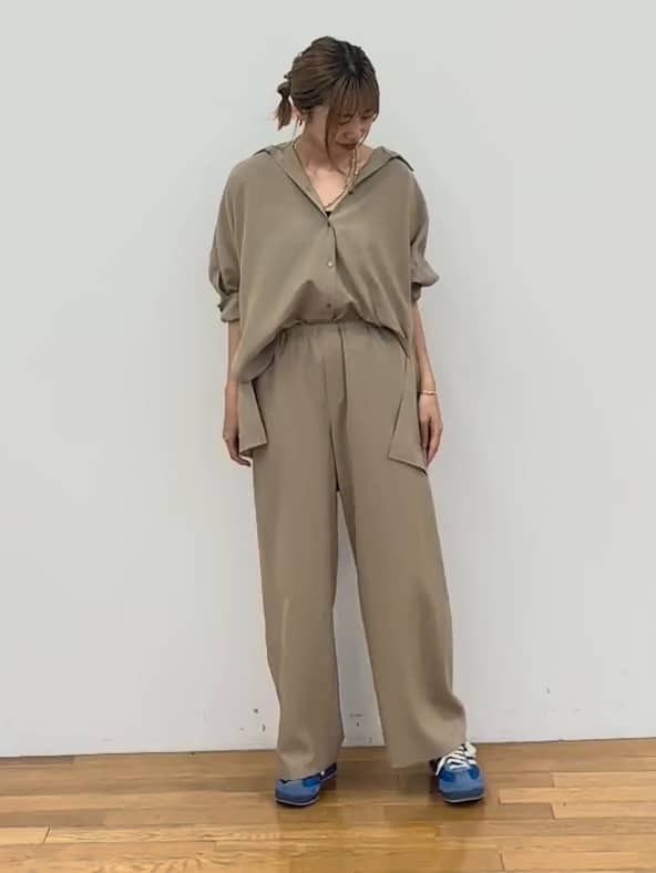 とろみのある素材感が魅力のシャツ&パンツをベージュのワントーンでセットアップに。身長164cmで程よくゆとりのあるサイズ感ながら、落ち感があるのですっきり見えも叶います。