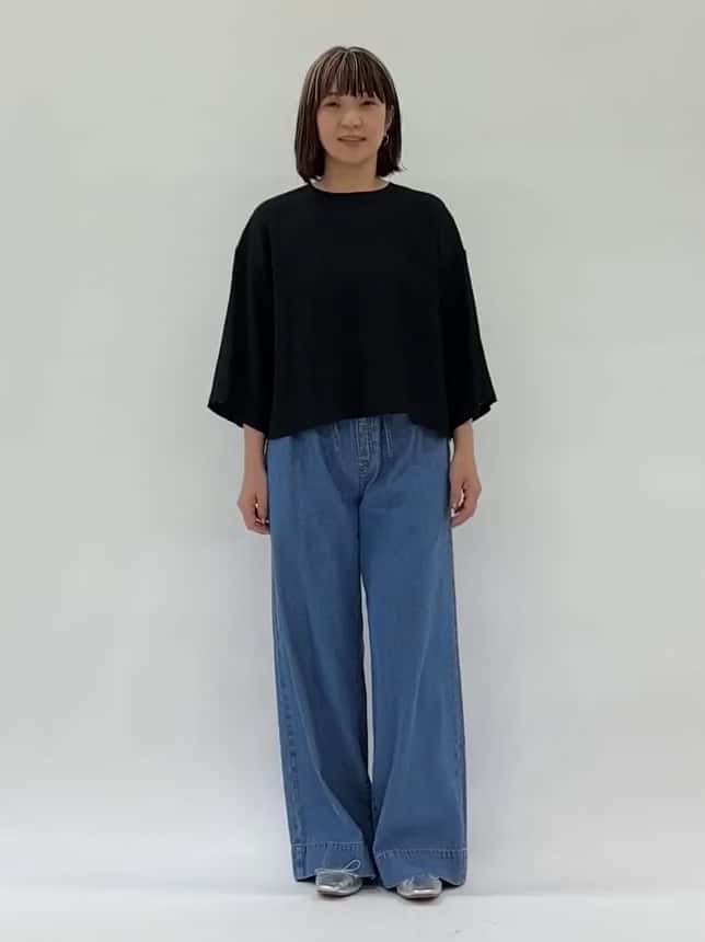 ブラックのトップスは、シャーリングのような立体感が特徴で、さらっとしたドライタッチが暑い日にも快適。ゆとりのあるシルエットで風通しがよく、Tシャツ感覚で着られるのにきちんと見えする一枚です。通気性・速乾性が高く、真夏も頼れるアイテムです!