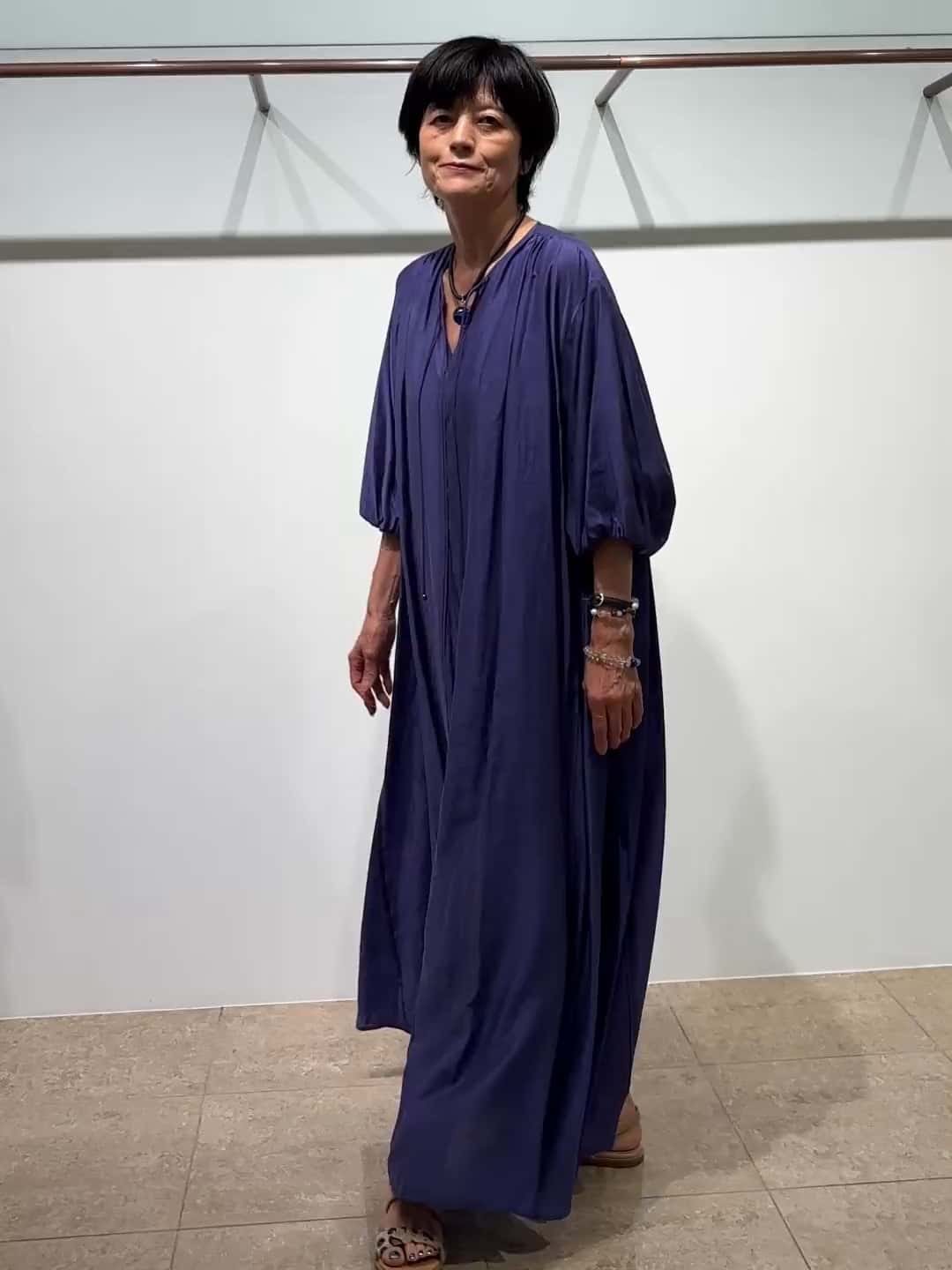 上品な光沢感と程よいシアー感で清涼感のあるワンピース。程よいボリューム感とAラインのシルエットが綺麗です。53EFA152 2/① パープル