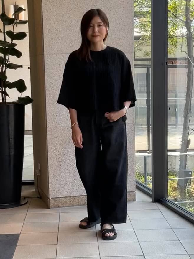 デニムは、新色のブラック。少し薄手でくたっと柔らかく、肌あたりも◎。太めのワイドシルエットですが、170cmの高身長でもゆとりがあり、バランス良く履けました。