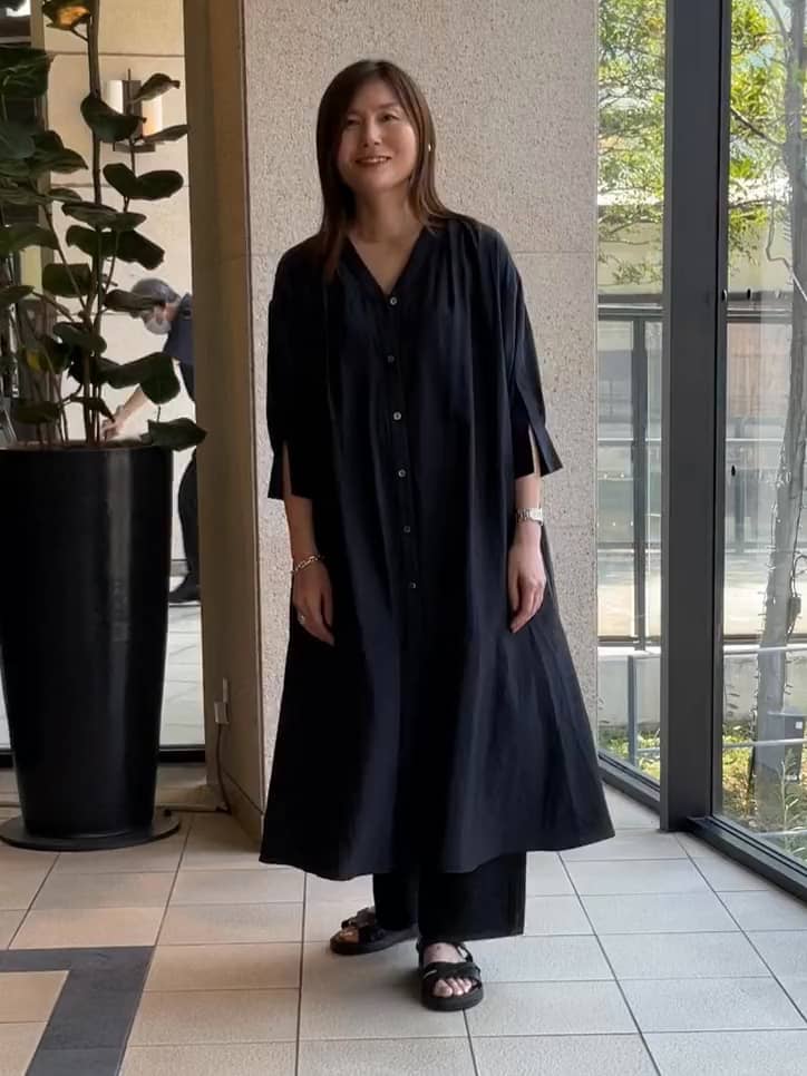 ワンピースは長めの6分袖でカフス部分に抜けがあり、暑い日も快適。単体でももちろん、ボトムを重ねて着ると一気に鮮度のある着こなしに。